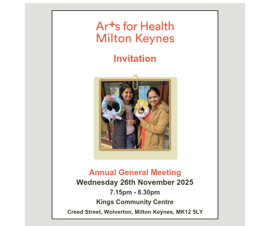 Arts for Health Milton Keynes is the working name of MK Arts for Health charity number 1107625 company number 05137693