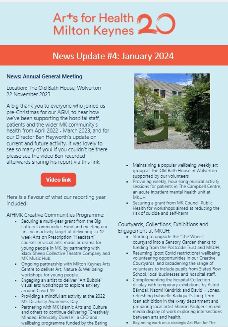 Arts for Health Milton Keynes is the working name of MK Arts for Health charity number 1107625 company number 05137693
